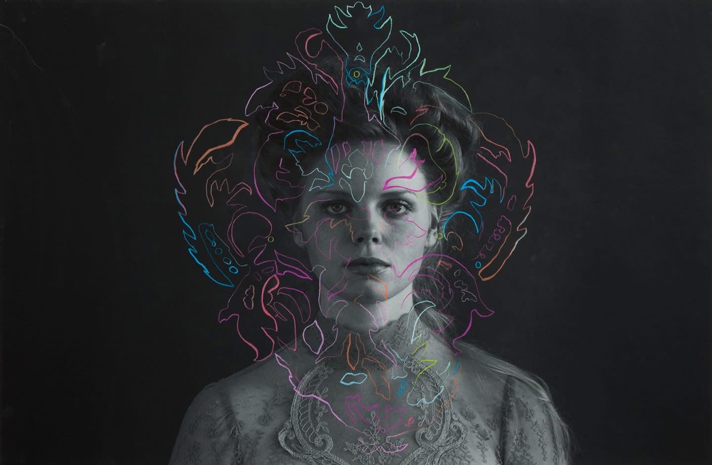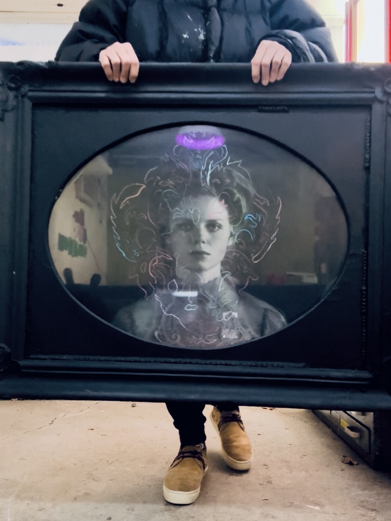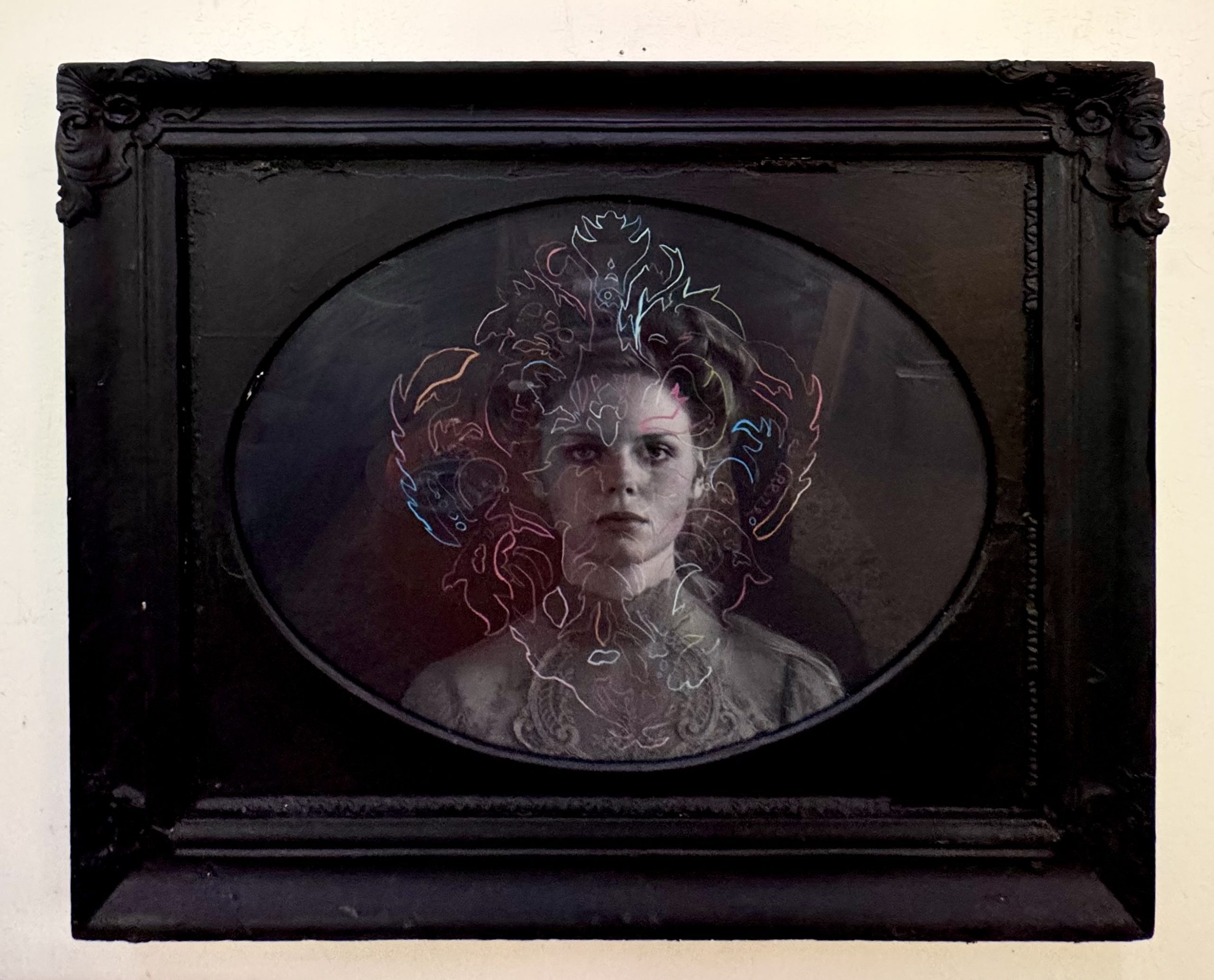 colored pencil on giclee photograph, heavyweight cotton paper. Framed under glass to 32”x40”x2” in antique, upcycled frame, painted black.