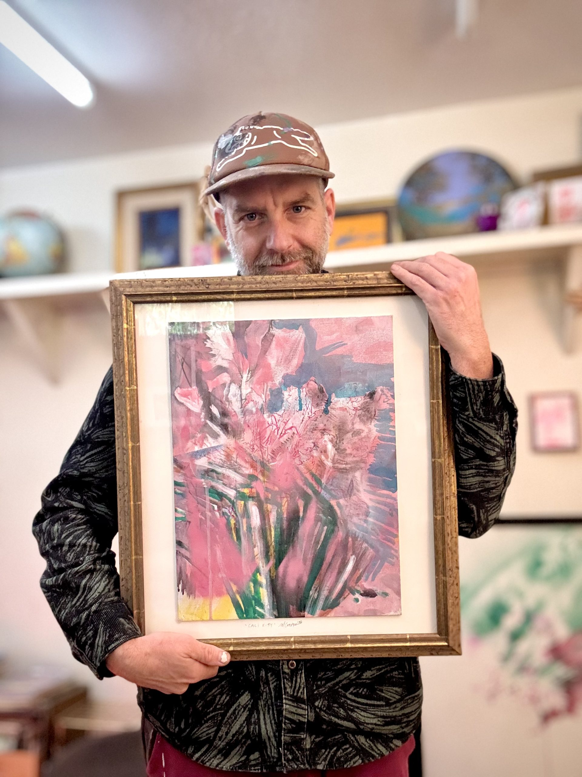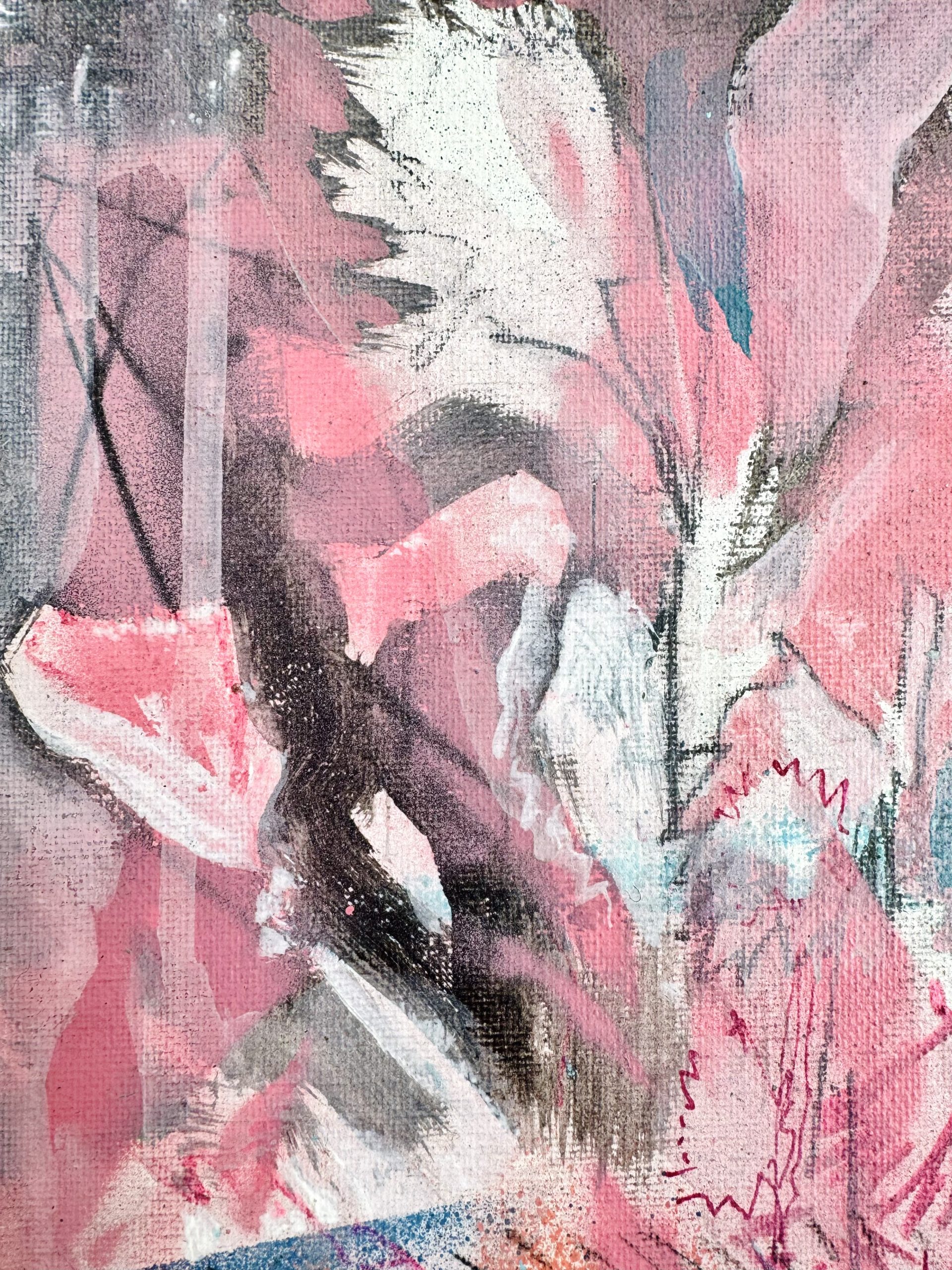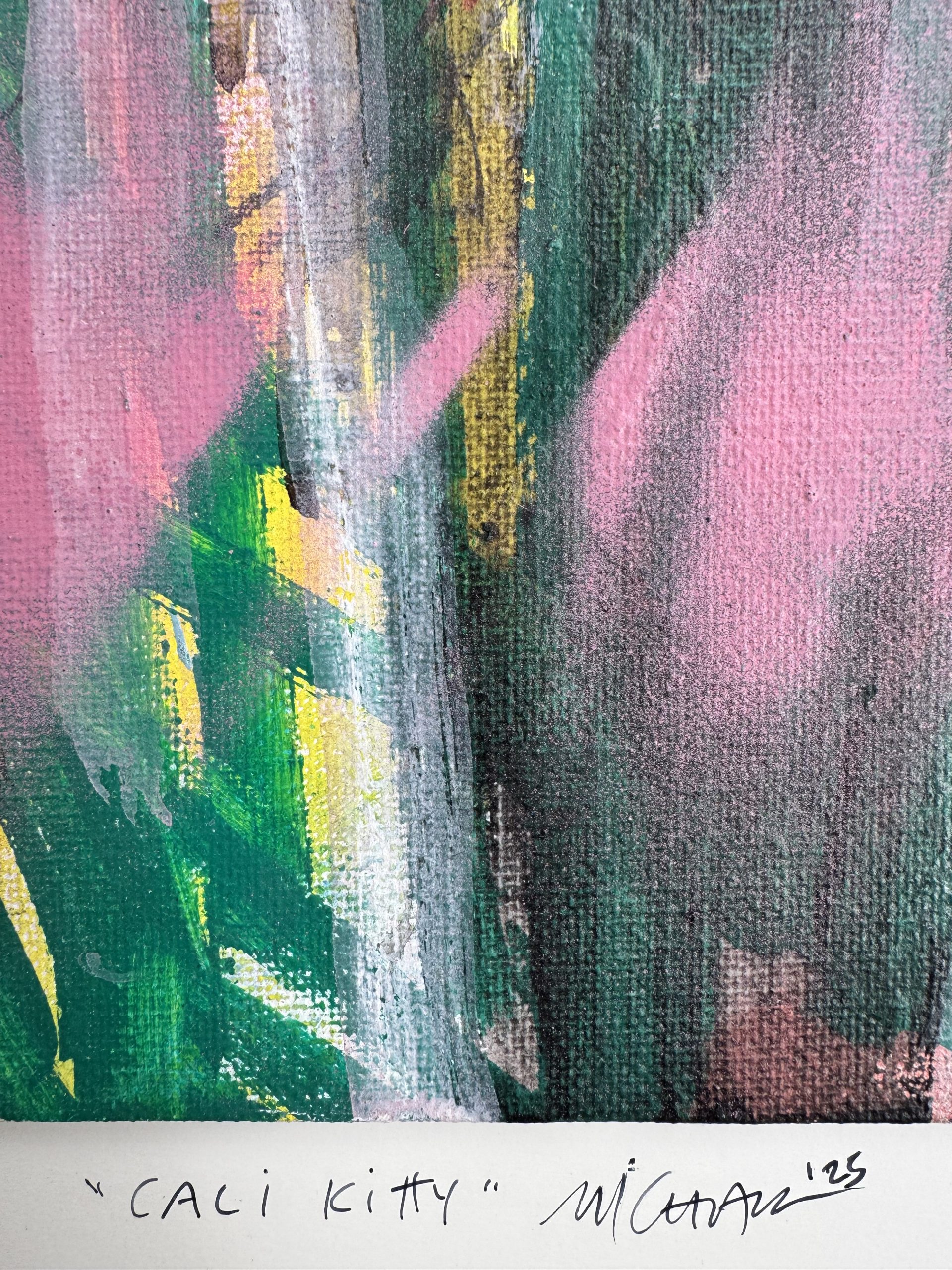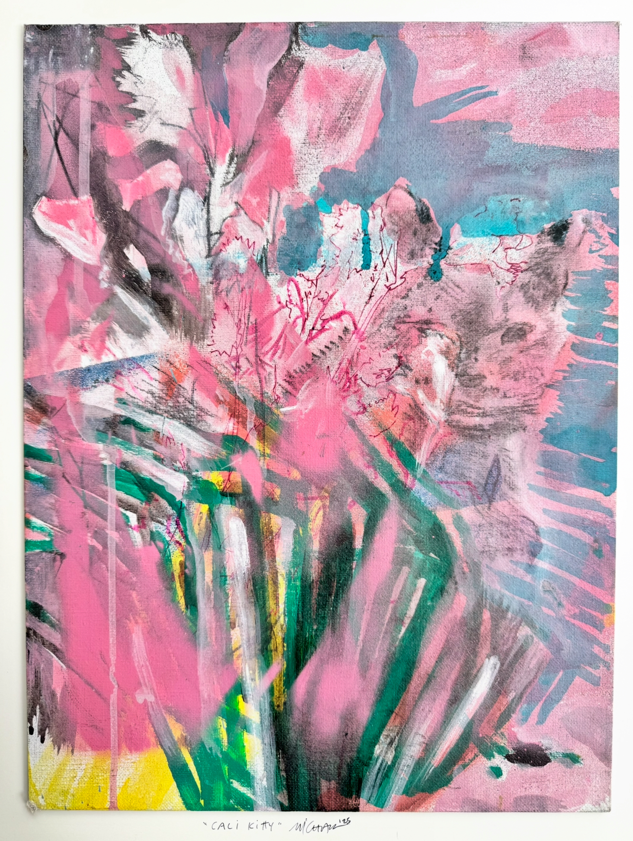 “Cali Kitty”, charcoal, water, acrylic, ink, and spray paint on canvas board, mounted and framed under glass to 21”x18”.