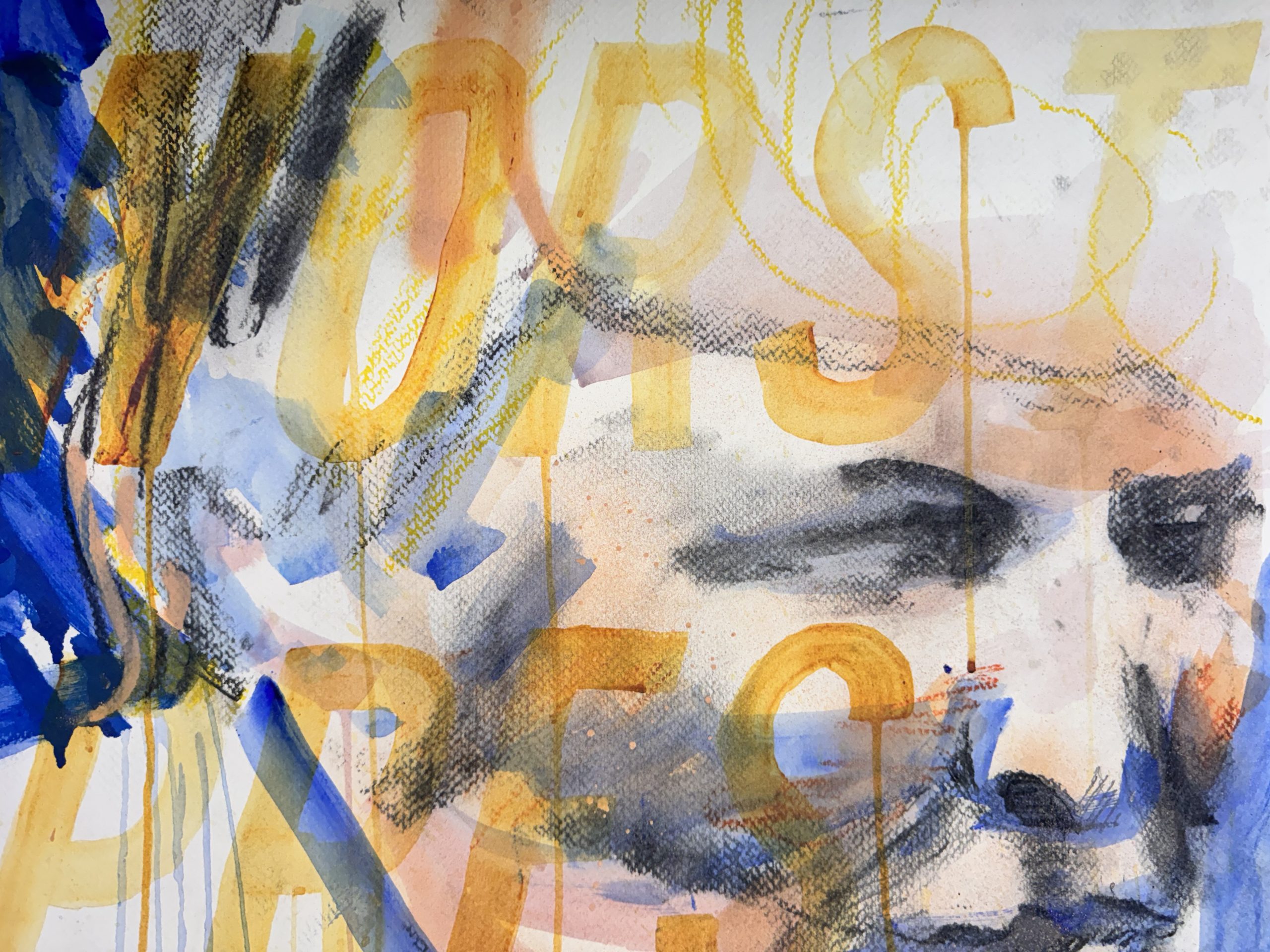 38”x25”, acrylic, water, charcoal, watercolor crayon, footprints and spray paint on heavyweight cotton paper